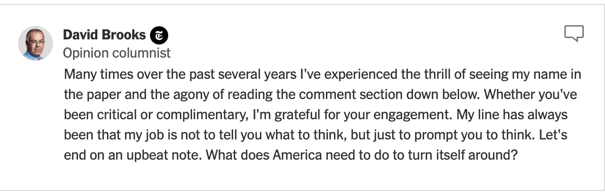 My friend Howard called tonight and suggested a few articles for me to read, including an opinion piece by David Brooks called “Time to Say Goodbye.” I read it multiple times, trying to soak up the wisdom, history and direction he imparted. It’s a dense piece. I will save it for future reference and reread it again when I feel cynicism seeping back in. But, my one big takeaway is that there’s hope for a better tomorrow.
